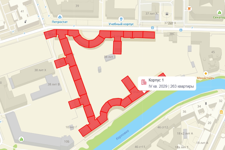 Секции клубного квартала формируют 2 внутренних полузакрытых двора и 3 парадных двора-курдонера, открытых на набережную р. Карповки. На территории комплекса спроектированы детские площадки, зоны для спорта, велосипедная дорожка, променад, благоустроенная набережная с причалом. Особый шарм придает сохраненная с императорских времен артезианская скважина. В проекте имеется собственный детский сад и начальная школа. Для жителей дома спроектированы индивидуальные кладовые, а для владельцев автомобилей предусмотрен подземный паркинг с прямым доступом на лифте.